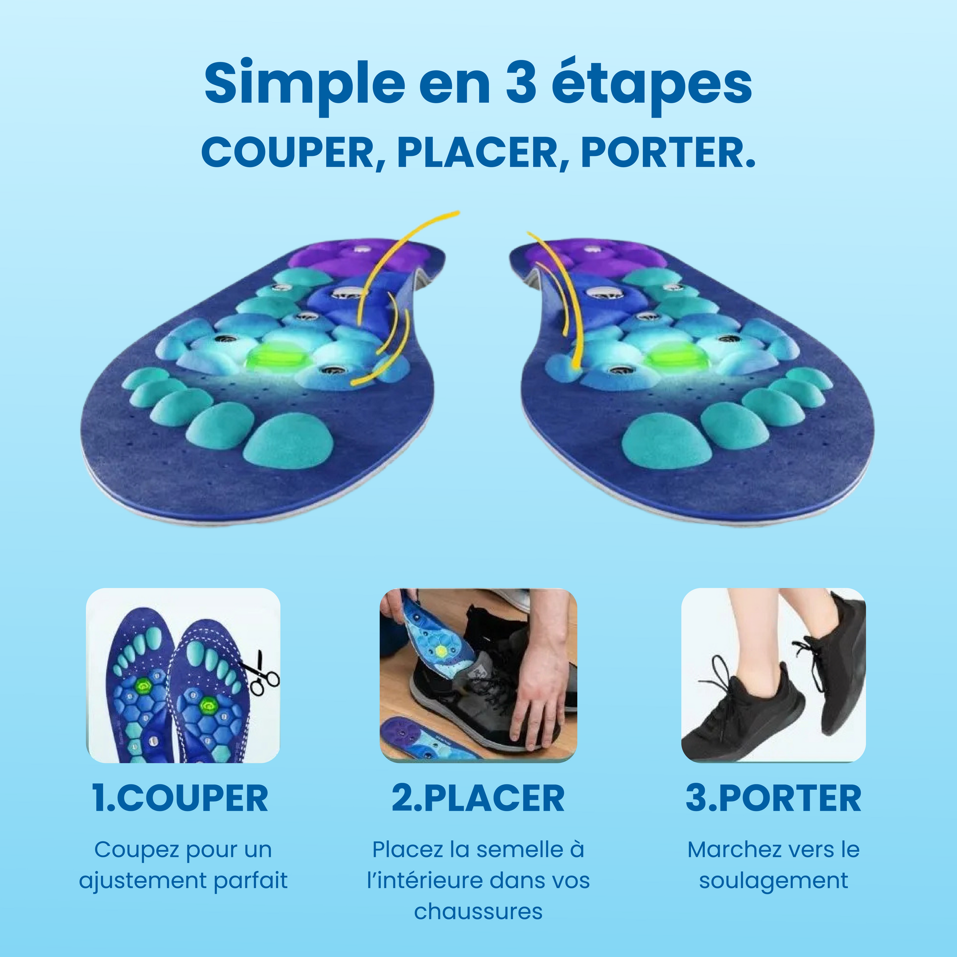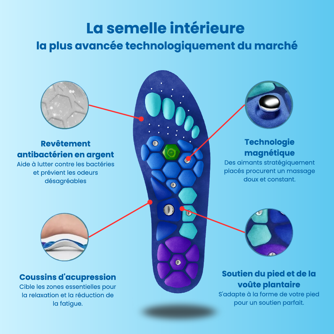 Les semelles magnétiques premium Magnétiva sont conçues pour traiter ce problème à la racine. Elles contiennent des aimants stratégiquement placés qui créent des champs magnétiques subtils.